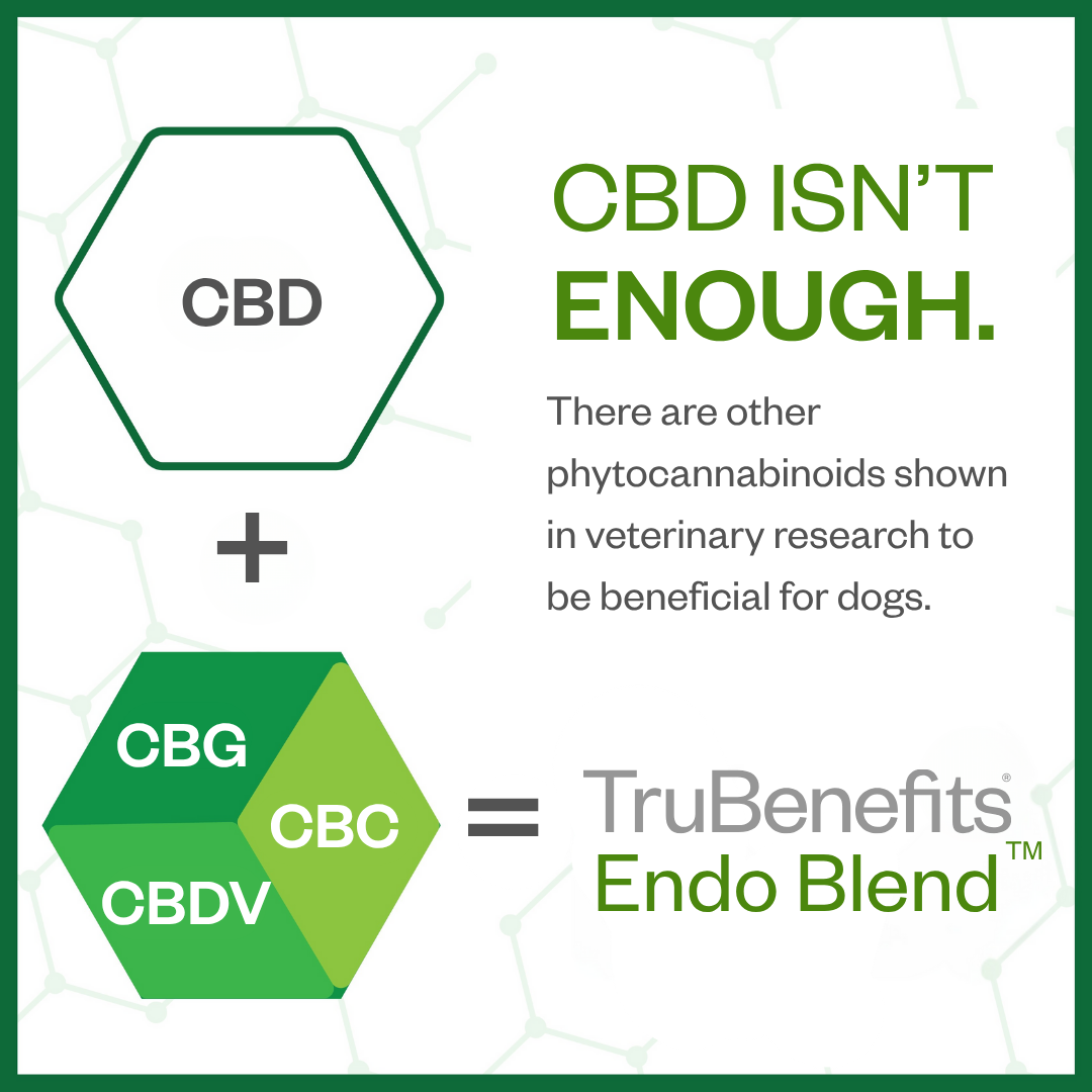 TruBenefits® Endo Blend is a safe and effective phytocannabinoid product formulated by veterinary specialists as a natural way to influence most major body systems for canine health. It works by interacting with the endocannabinoid system, a group of specialized receptors found in the brain, spine, peripheral nerves, blood vessels, and immune system. This interaction helps relieve occasional discomfort and supports the nervous, gastrointestinal, and immune systems.